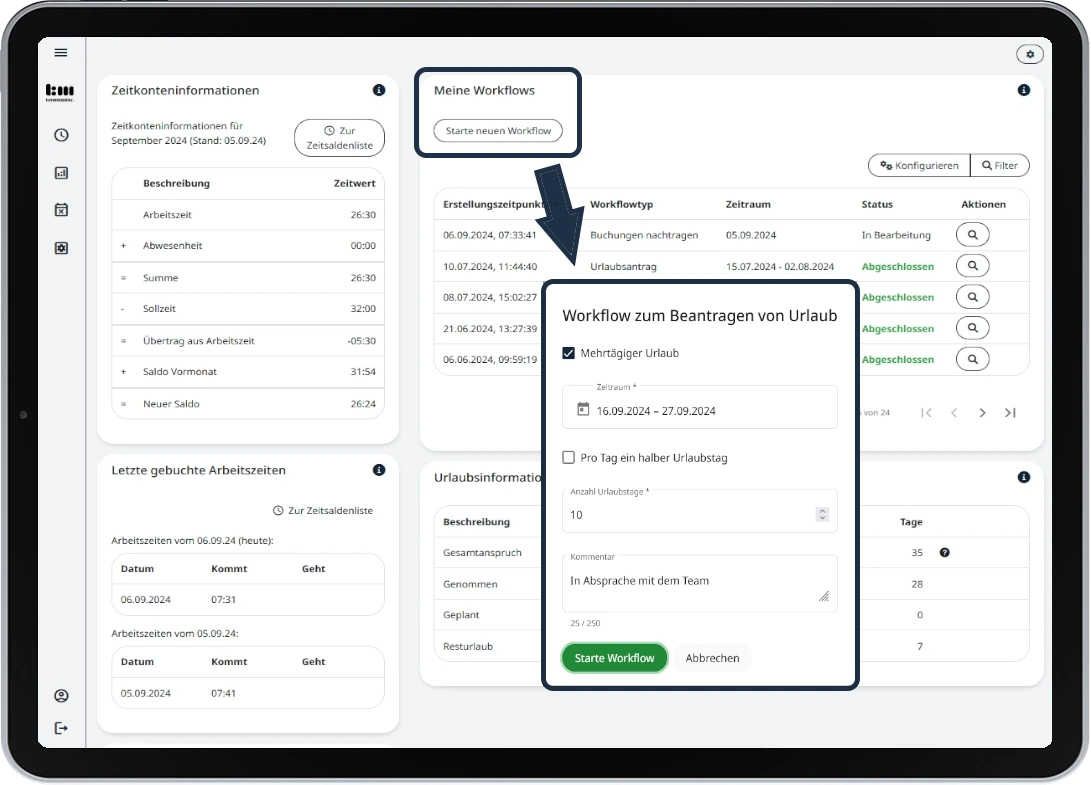 Abwesenheiten wie Urlaub, Krankheit oder Homeoffice lassen sich mit wenigen Klicks erfassen und verwalten. Sie behalten jederzeit den Überblick und können Ausfallzeiten rechtzeitig erkennen. Automatisierte Genehmigungsprozesse sparen Zeit und reduzieren Verwaltungsaufwand erheblich.