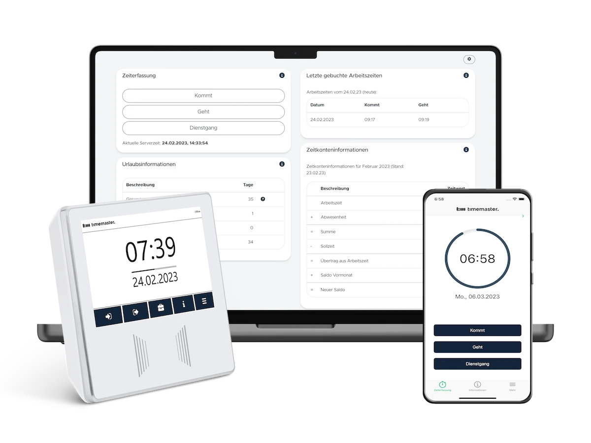Mit der Timemaster App können Mitarbeiter ihre Arbeitszeiten von überall mobil erfassen. Die App erlaubt die Buchung von Arbeitszeiten und den Abruf wichtiger Zeitinformationen, wie die letzten gebuchten Arbeitszeiten, Überstundenständen und auch Urlaubsinformationen direkt auf dem Smartphone. Die App ist für iOS und Android in den jeweiligen Stores kostenlos für Mitarbeiter verfügbar.