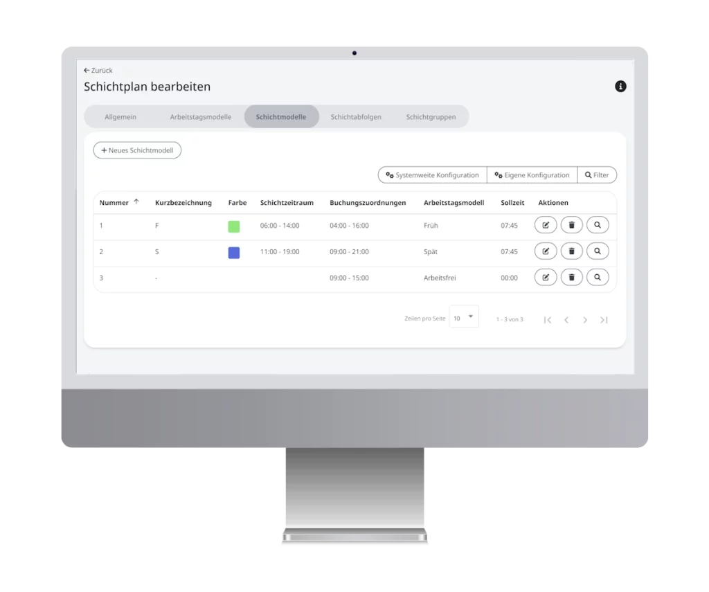 Schichten lassen sich über die Timemaster Software individuell erstellen und einzelnen Mitarbeitenden über Verträge direkt zuweisen.