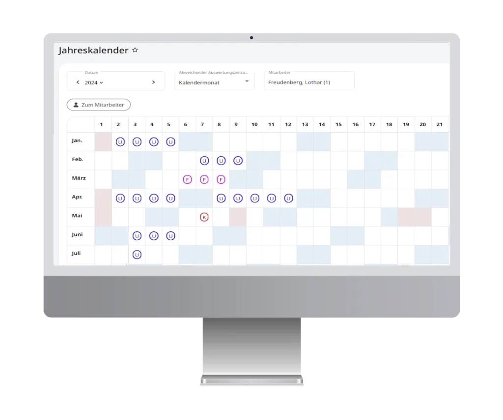 Die Timemaster Zeiterfassung bietet Funktionen zur Jahresplanung, in der alle beantragten und genehmigten Urlaube für das gesamte Jahr angezeigt werden. So können sowohl Mitarbeitende als auch Verantwortliche frühzeitig planen und Engpässe vermeiden.